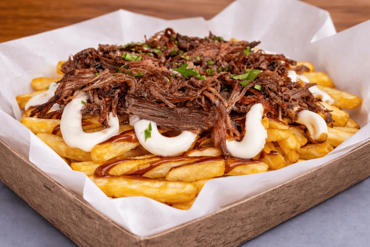 Batata palito (350g in natura), costela bovina defumada desfiada, requeijão cremoso, molho barbecue decorado com salsa.