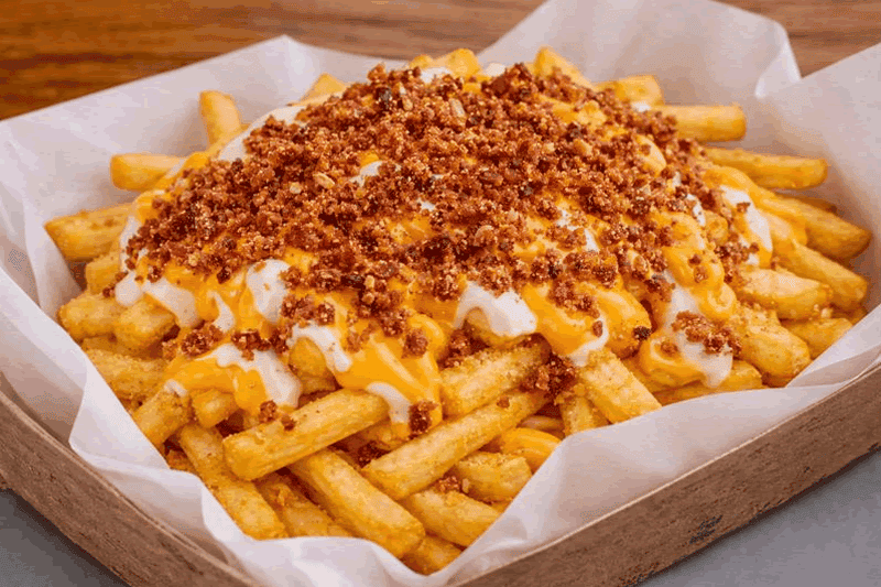 Batata Palito (350g in natura), mussarela, requeijão, cheddar e farofa de bacon