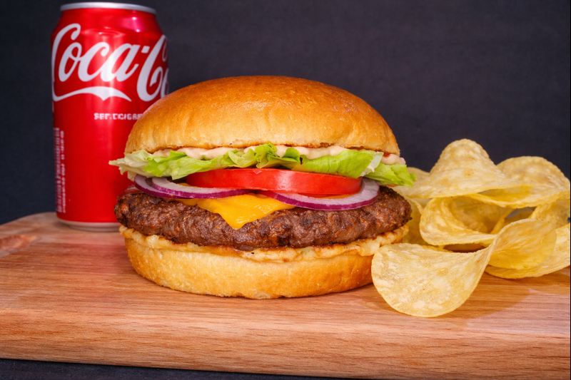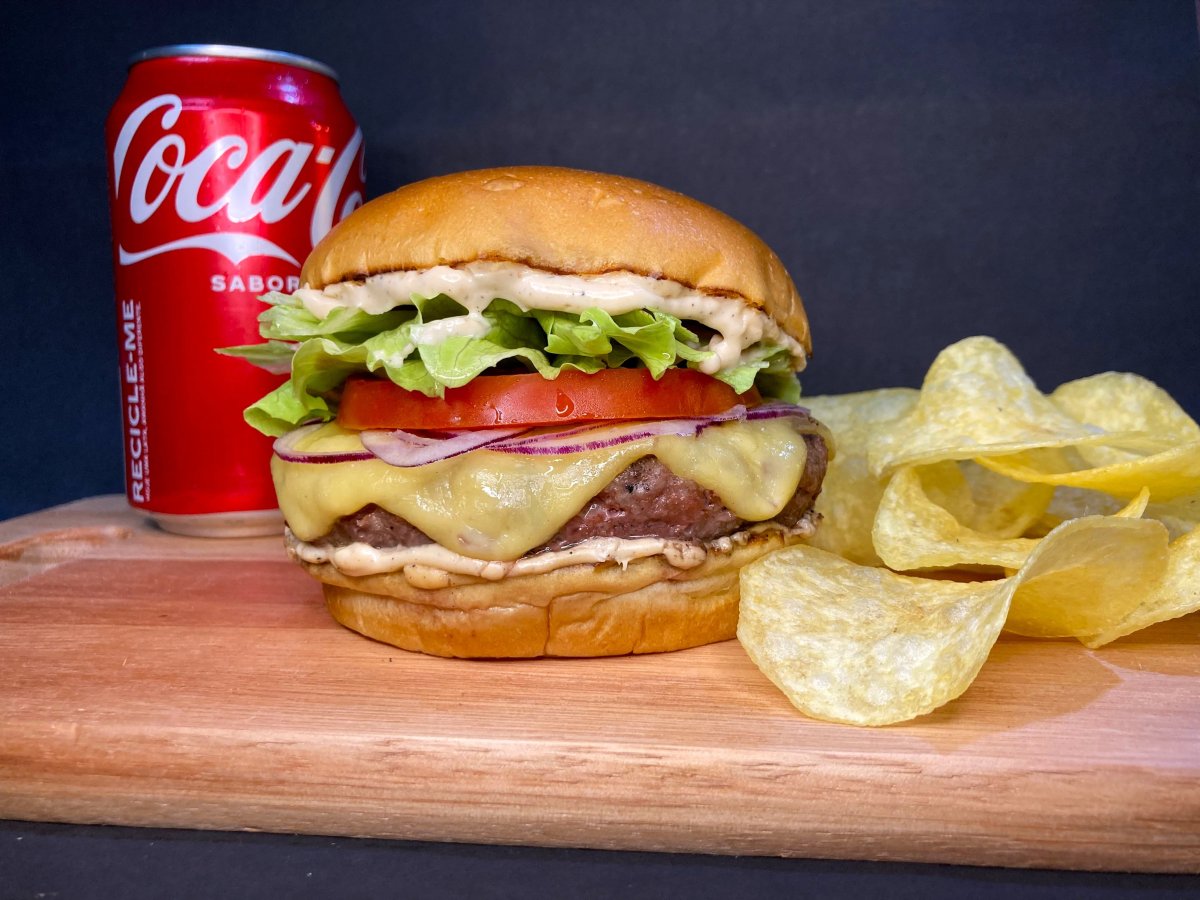 Pão brioche, hambúrguer de 100g, queijo cheddar, alface, tomate, cebola e maionese da casa.