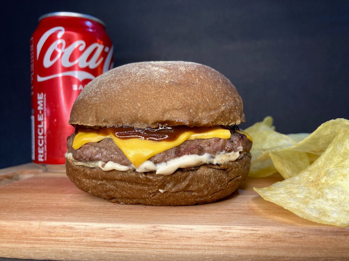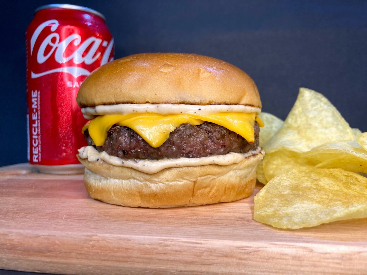 Pão brioche, hambúrguer de 160g, queijo cheddar e maionese da casa.