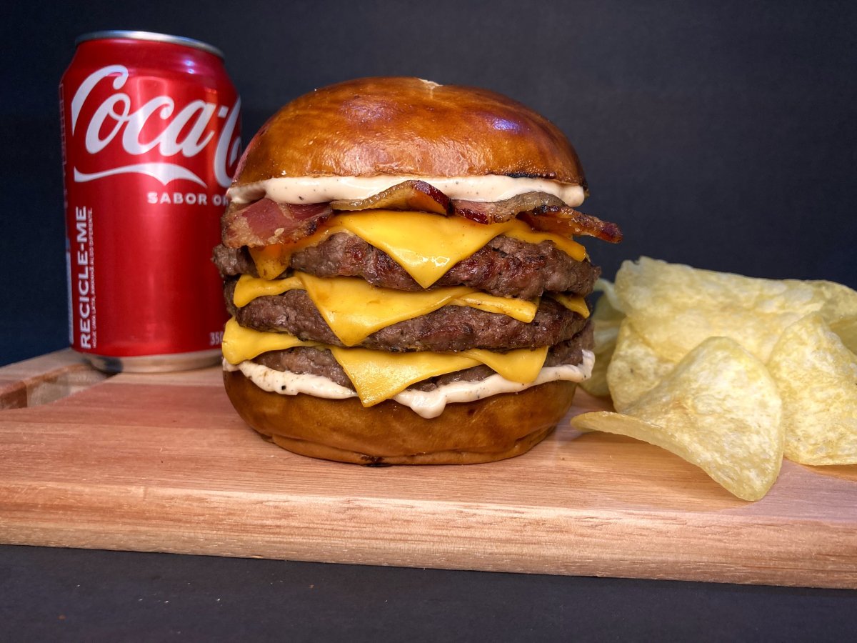 Pão X pincelado, 03 hambúrgueres de 100g, queijo cheddar, bacon e maionese da casa