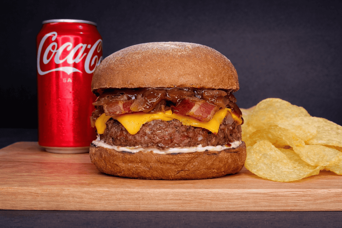 Pão australiano, hambúrguer de 160g, queijo cheddar, cebola caramelizada, bacon, maionese da casa e molho barbecue.