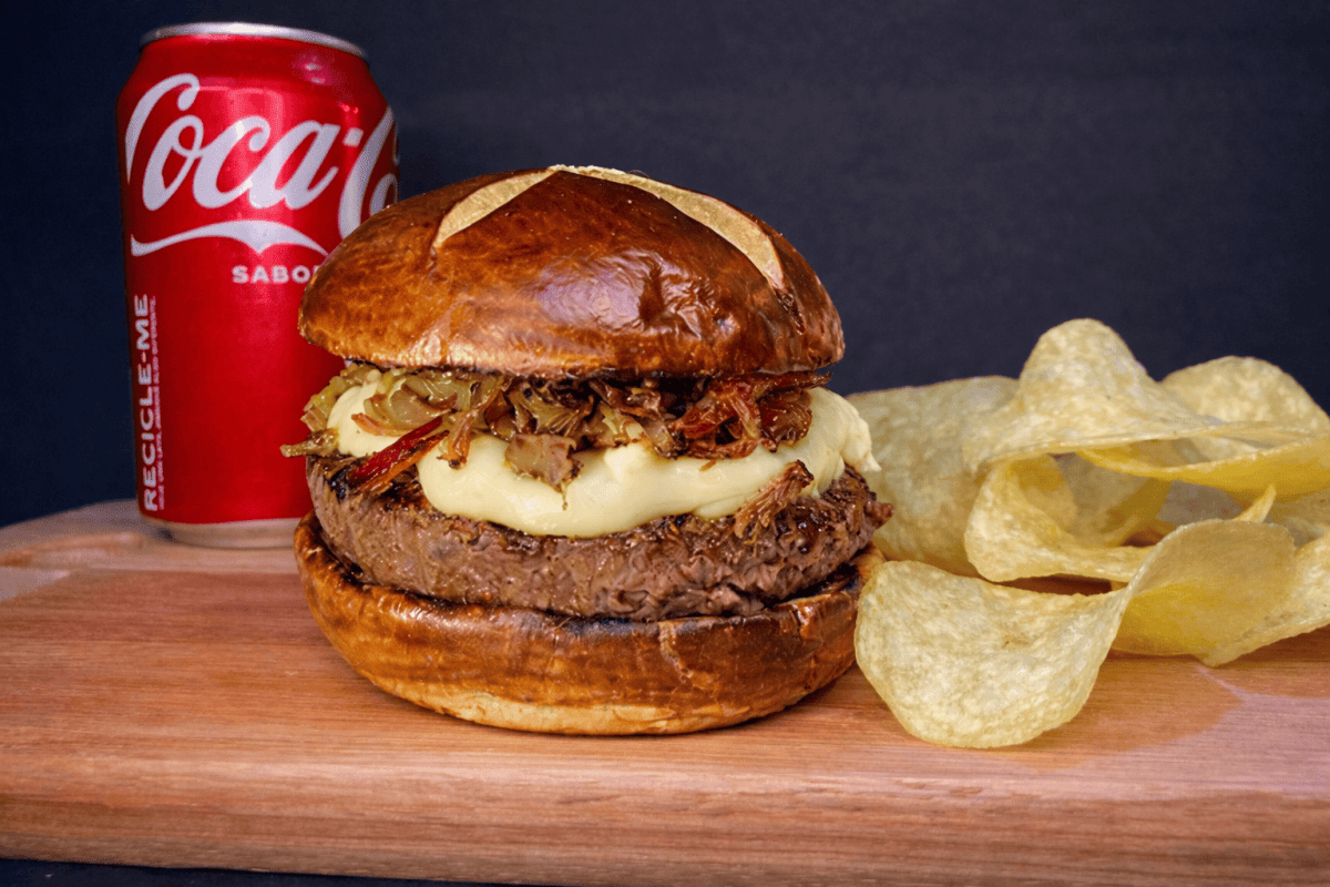 Pão X, hambúrguer de 160g grelhado na brasa, Catupiry Original e costela bovina defumada e desfiada.
