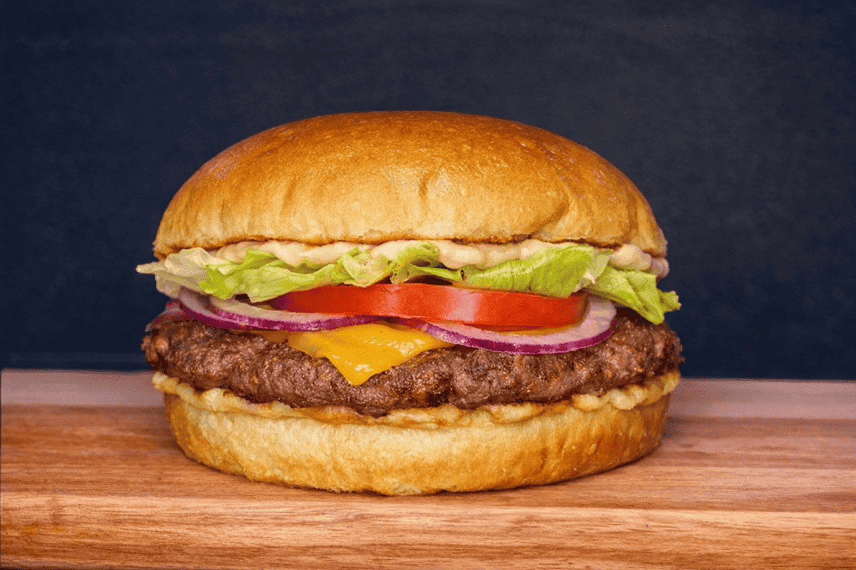 Pão brioche, hambúrguer de 100g, queijo cheddar, alface, tomate, cebola e maionese da casa.