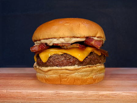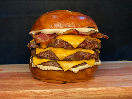 Pão X pincelado, 03 hambúrgueres de 100g, queijo cheddar, bacon e maionese da casa