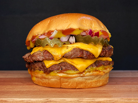 Pão brioche, 02 hambúrgueres de 100g, queijo cheddar, ketchup, mostarda, cebola roxa e picles artesanal.