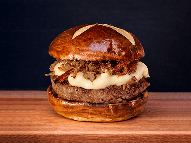 Pão australiano, hambúrguer de 160g, queijo cheddar, cebola caramelizada, bacon, maionese da casa e molho barbecue.